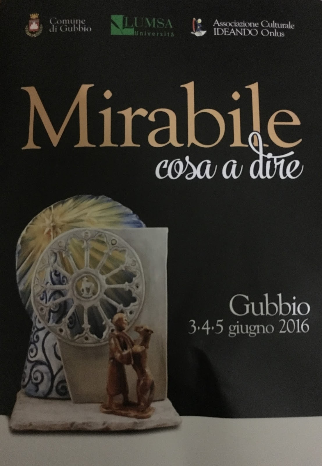 Tre giorni ricchi di incontri e dibattiti, ad anticipare la messa in scena serale dello spettacolo Mirabile cosa a dire, interpretato, tra gli altri, da Ugo Pagliai e Paola Gassmann, presenti in sede di conferenza, accanto ai giovani talenti del palcoscenico Ariele Vincenti e Nicholas Gallo. Sottolineati nella mattinata del 24 Maggio l’originalità e il forte legame della città ospitante con il tema francescano. Tra i presenti anche il sindaco eugubino Filippo Mario Stirati e l’assessore alla cultura Augusto Ancillotti, i quali, insieme al Rettore della LUMSA Francesco Bonini, il Prof. Gennaro Colangelo e Stefano Santini, rispettivamente direttore artistico ed organizzativo con l’Associazione Ideando Onlus, hanno calcato la forte valenza culturale dell’evento per la città di Gubbio, posta, in tal modo, su un palcoscenico di valenza nazionale e, se vogliamo, anche internazionale date le premesse, un evento giubilare che ha come fulcro le opere del Santo di cui, in questo momento storico, dopo quasi otto secoli dalla sua scomparsa, l’uomo alla guida della Chiesa ha voluto assumerne il nome, dimostrando giorno dopo giorno un pontificato sempre più ricco di significati (cit. Gennaro Colangelo).